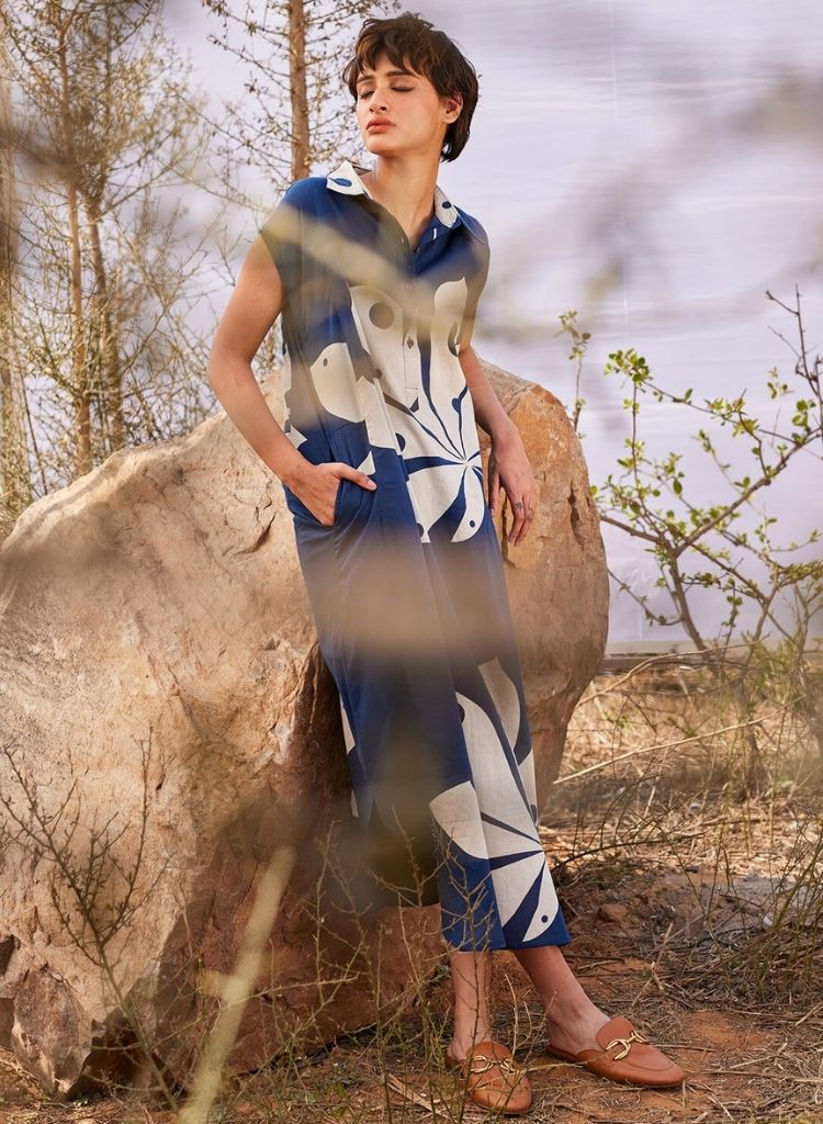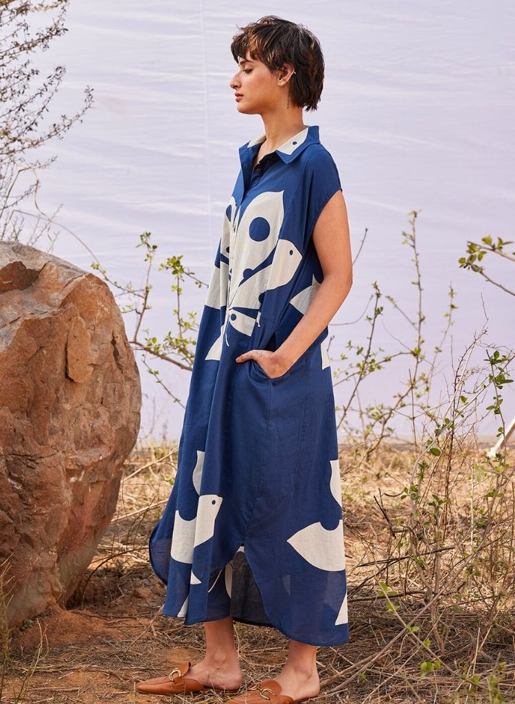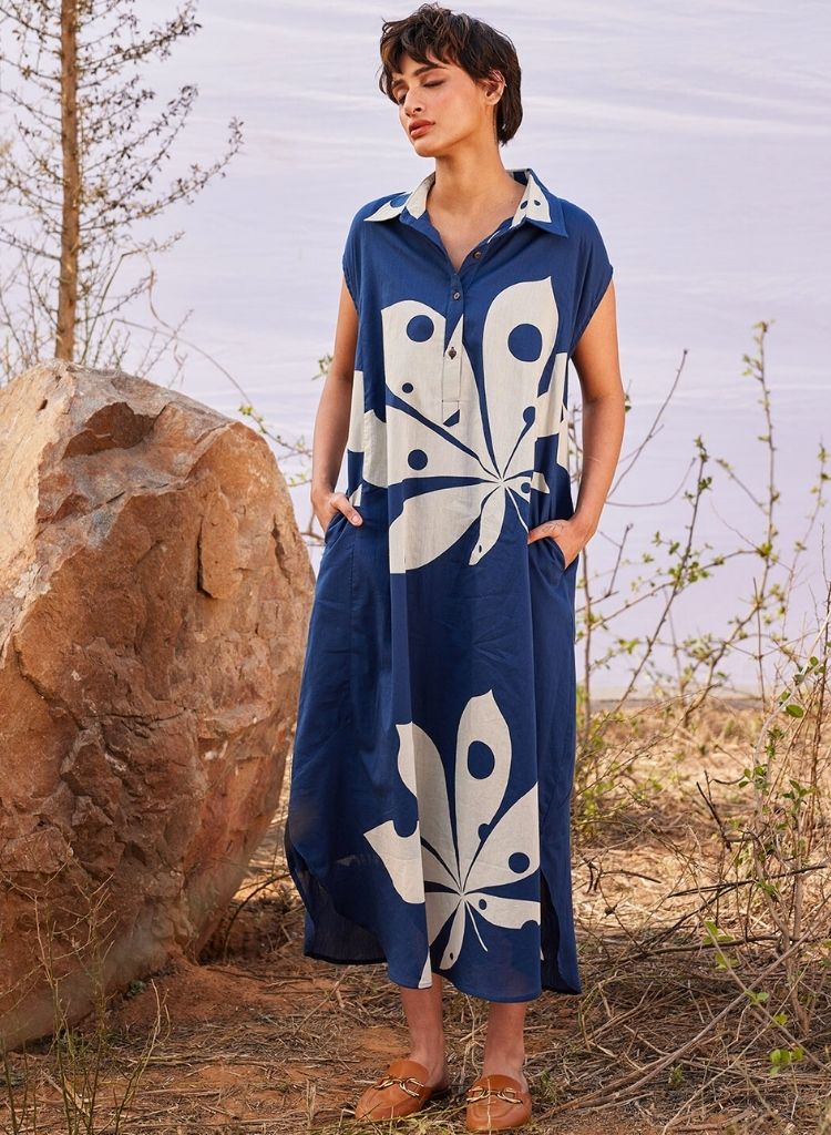 A classic long shirt dress with a statement print and a curved hem featuring a shirt collar, cap sleeves and inseam pockets. Length 51". The model is 5'7" and is wearing a size S.