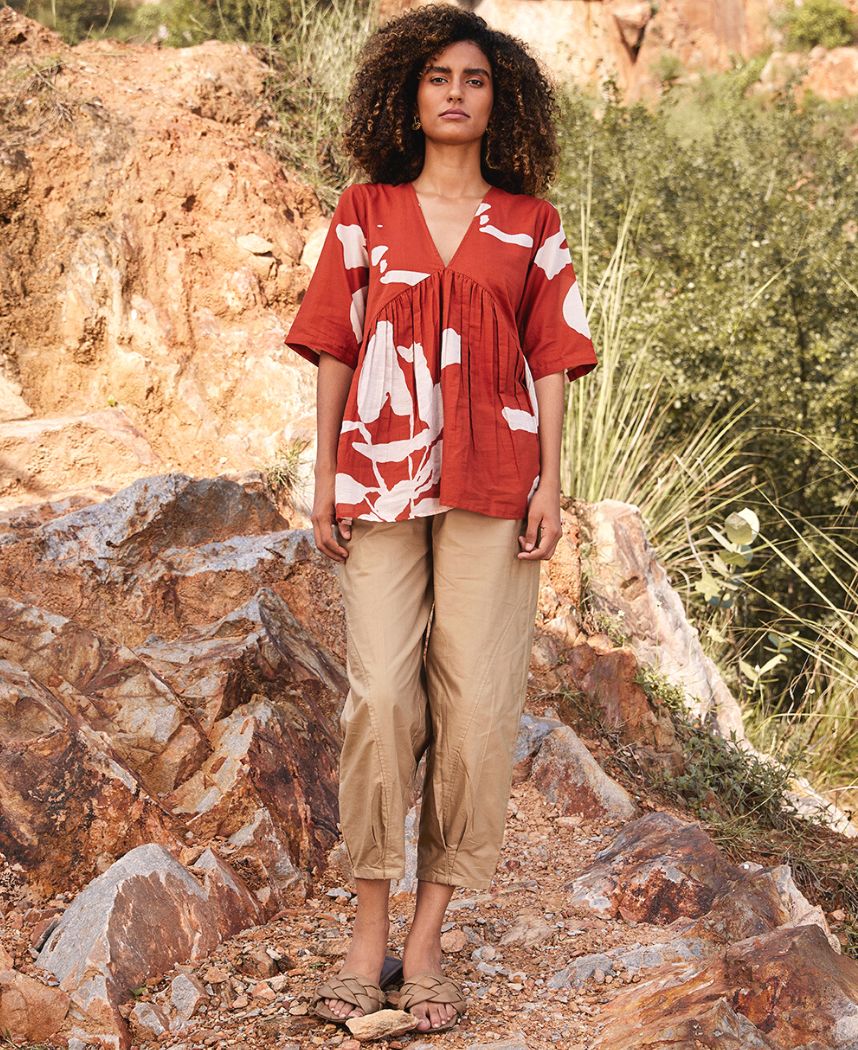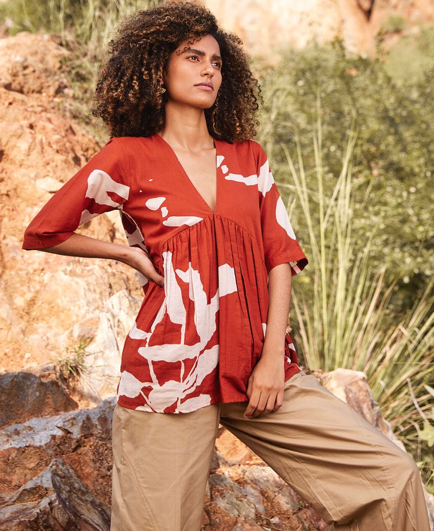 A relaxed fitting top with ruffle details featuring a V-neck and empire yoke. Length 27". The model is 5'8" and is wearing size S.