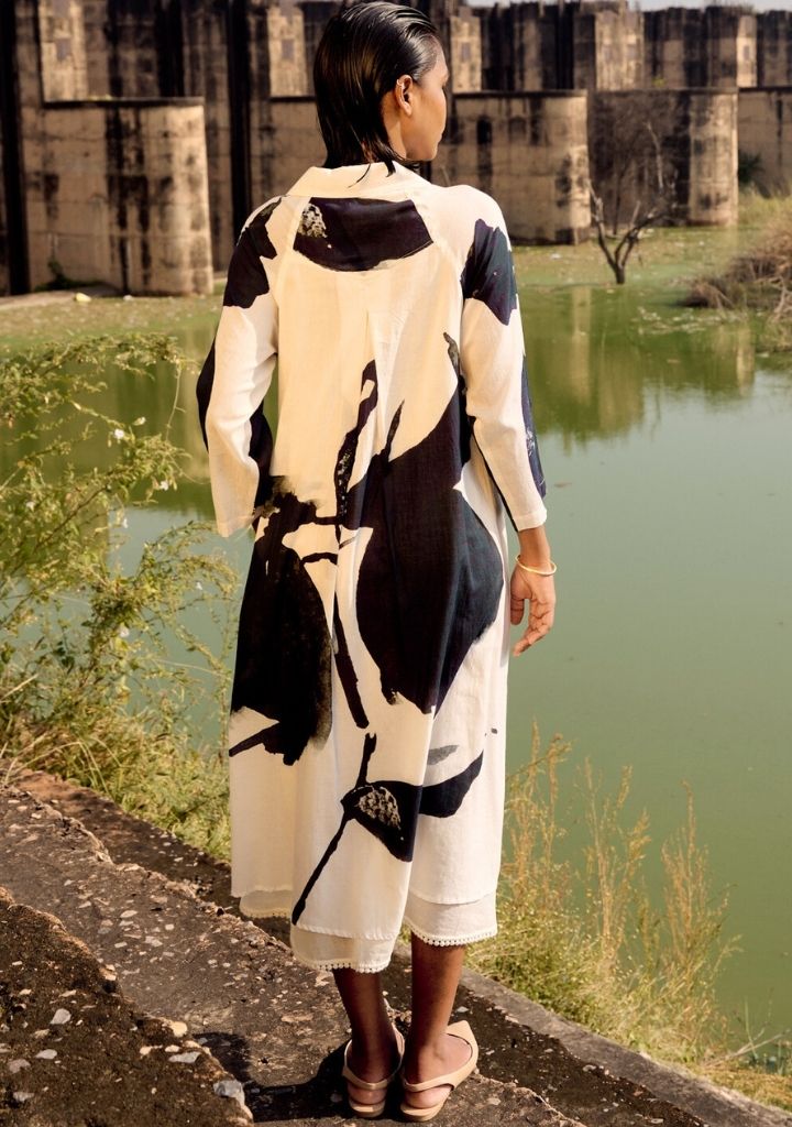 An art printed dress with back pleat details featuring a lapel collar, a front button opening and raglan sleeves. Comes with lace detailing at the lining. Length 45.5". The model is 5'7" and is wearing size S.