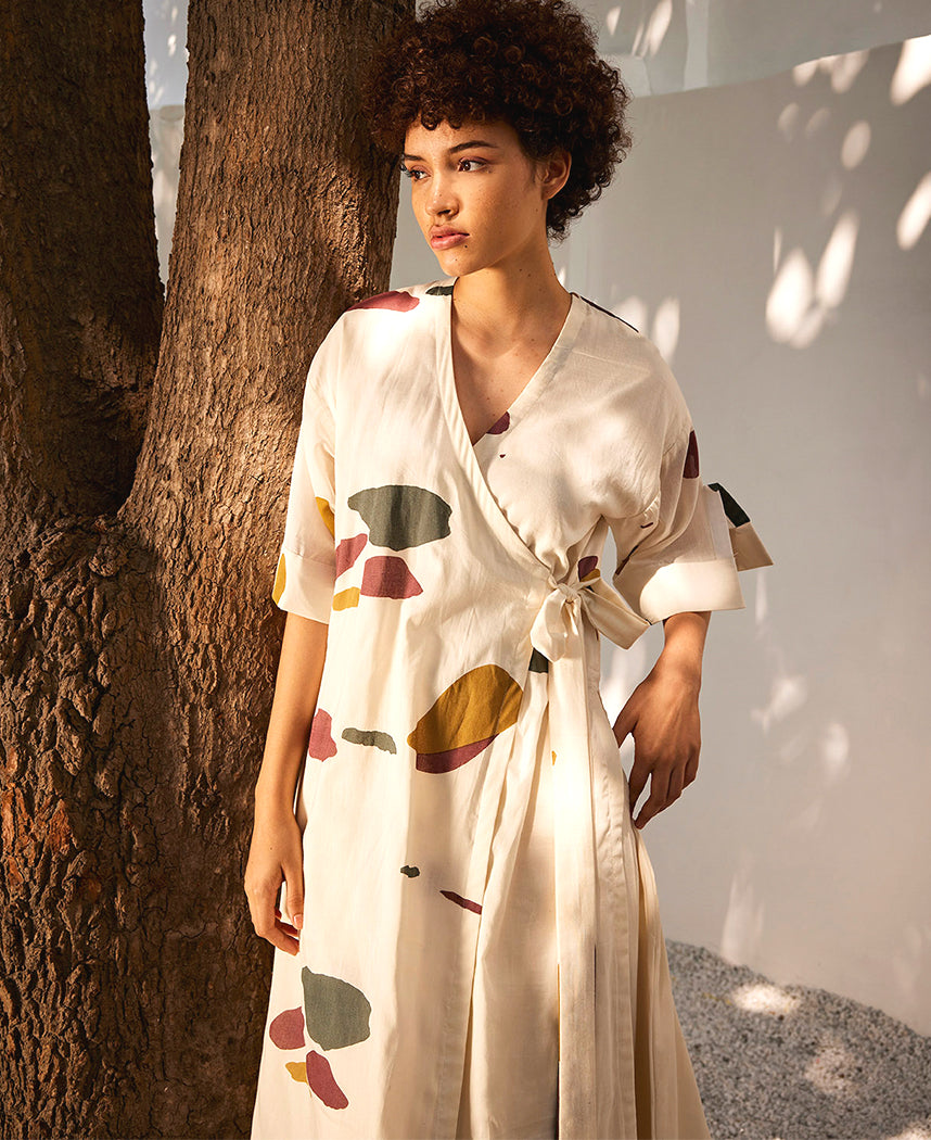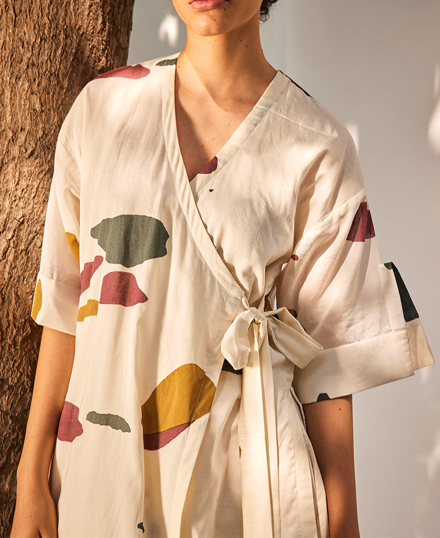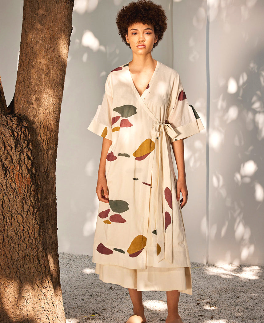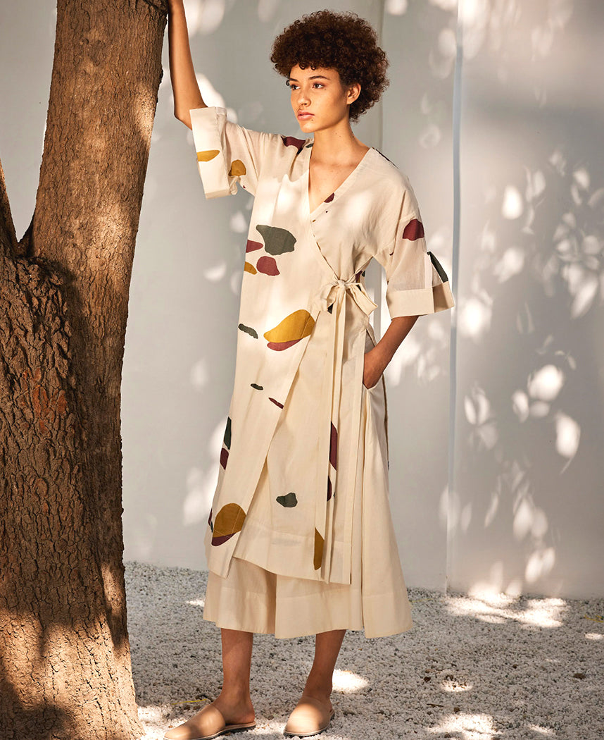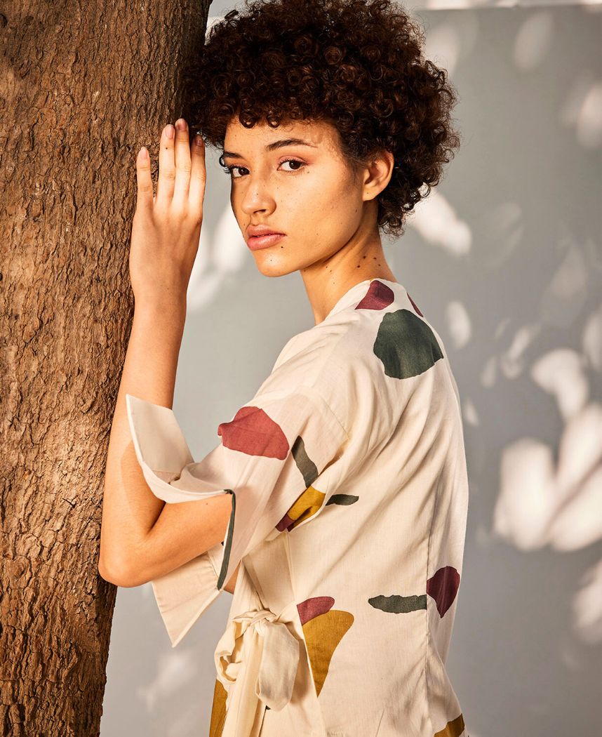 A two-piece set pairing a wrap tunic and flared pants. The wrap tunic features a V-neck, placket detailed sleeve and a side tie-up. Length 46.5". The flared pants feature elasticated waist bands. and inseam pockets. The model is 5'10" and is wearing size S.