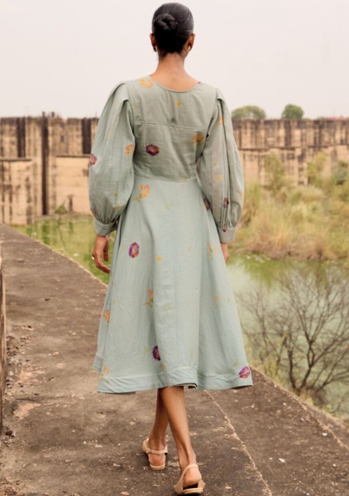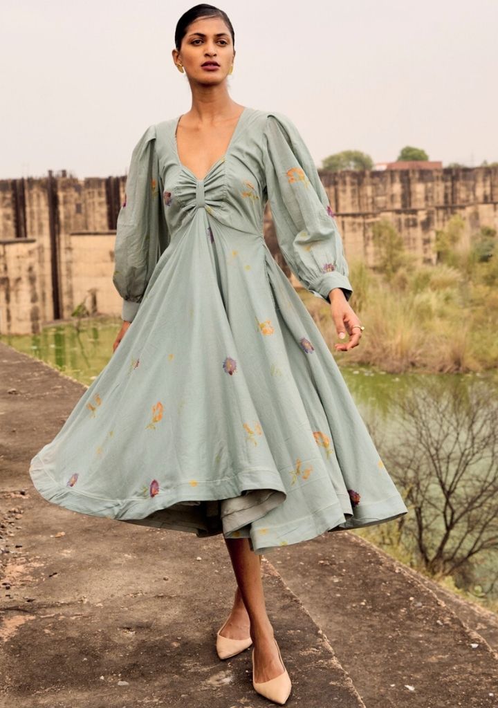 A floral printed dress featuring a front gathered panel, a side zipper opening and cuffed sleeves with opening. Length 45.5". The model is 5'9" and is wearing size S.