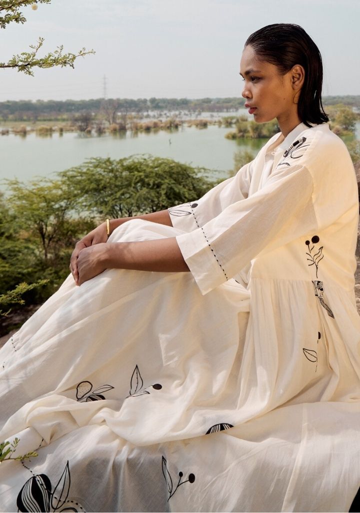 A printed maxi dress with mandarin collars, a front button opening, gathers around the waistline and hand running stitches along the hem of the dress and the sleeves. Length 51". The model is 5'7" and is wearing size S.