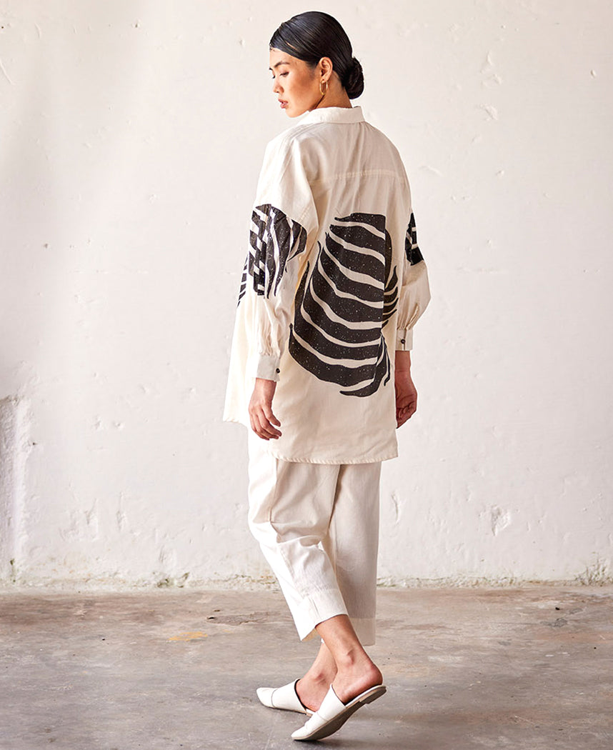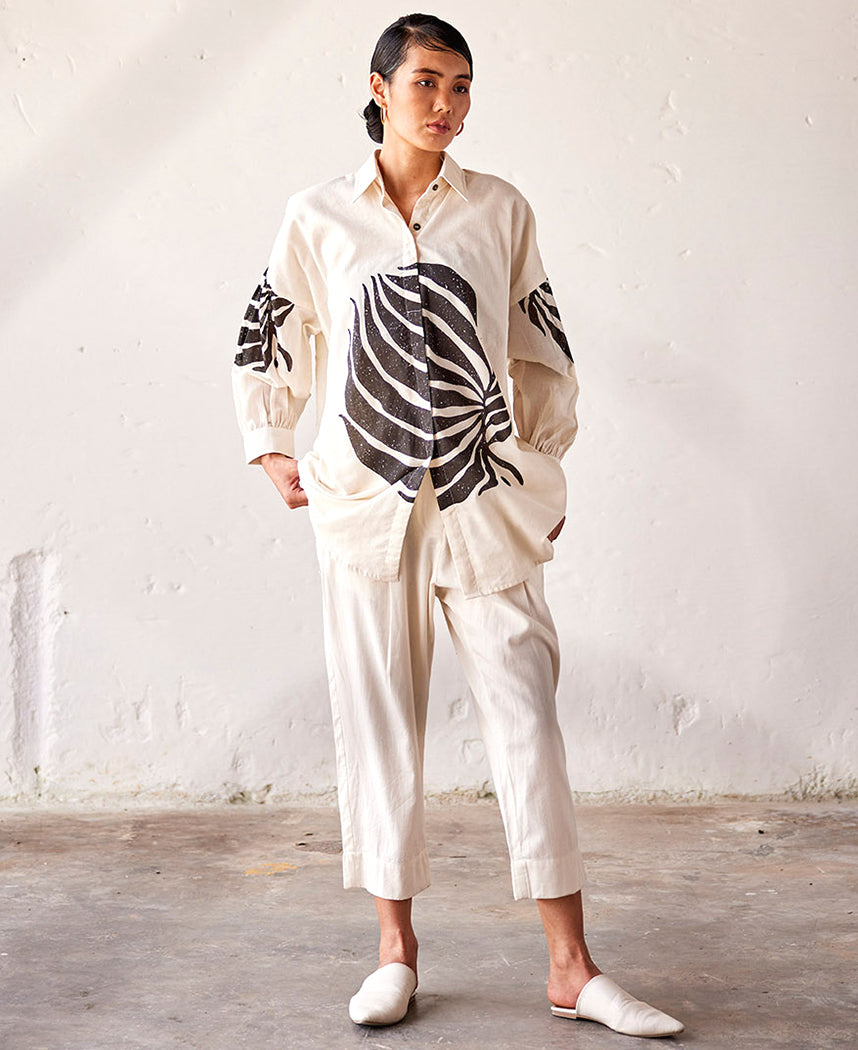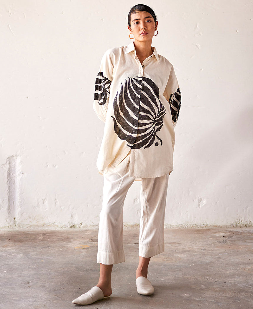 A two piece set pairing a printed shirt and solid pants. The printed shirt features a slim collar, a concealed front button placked and cuffed sleeves. Length 32". The solid pants feature a front button opening and an elasticated back waistline. Length 35". The model is 5'6" and is wearing size S.