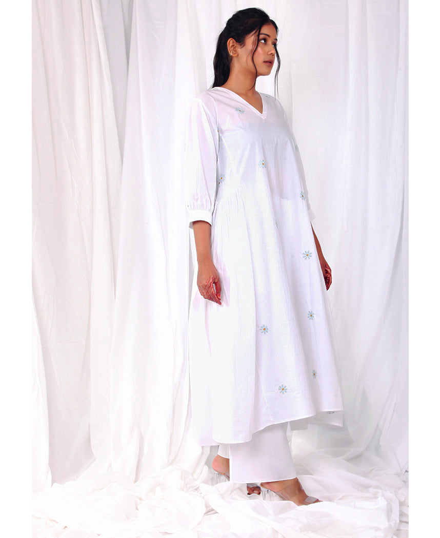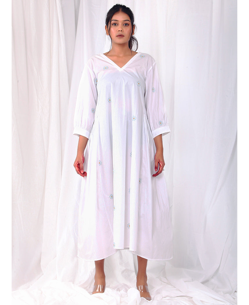 A two-piece set pairing the Daisy Floral Dress and a solid pant. The floral maxi dress features a V-neck, pleats on both sides and cuffed sleeves. Length 48". The pants feature inseam pockets and an elasticated waist. Length 38". The model is 5'8" and is wearing a size S.