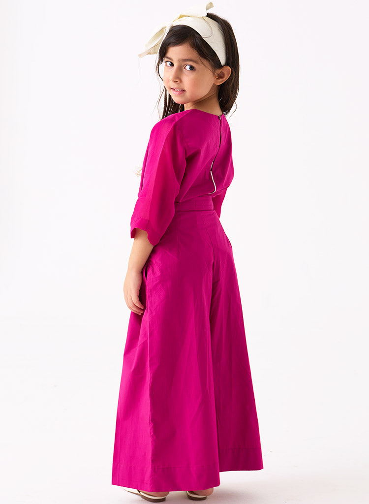 A two-piece set pairing the Floral Appliqué Top and wide-leg pants. The relaxed-fitting, floral appliqué top with a high neck and contrast centre back piping detail features relaxed sleeves and a back keyhole opening. The wide-leg pants with inverted box pleat detail feature a fitted waist and inseam pockets.