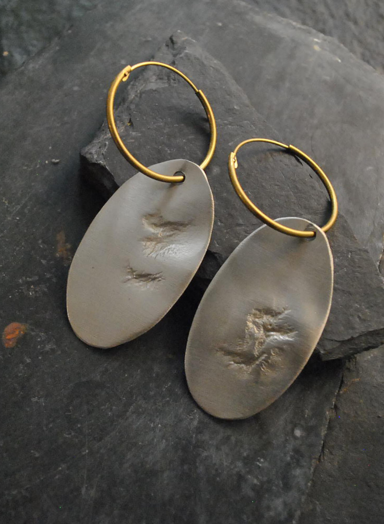 A pair of oxidised nickel finish earrings with a push back closure. Oval size - 5 cm x 2.5 cm.
