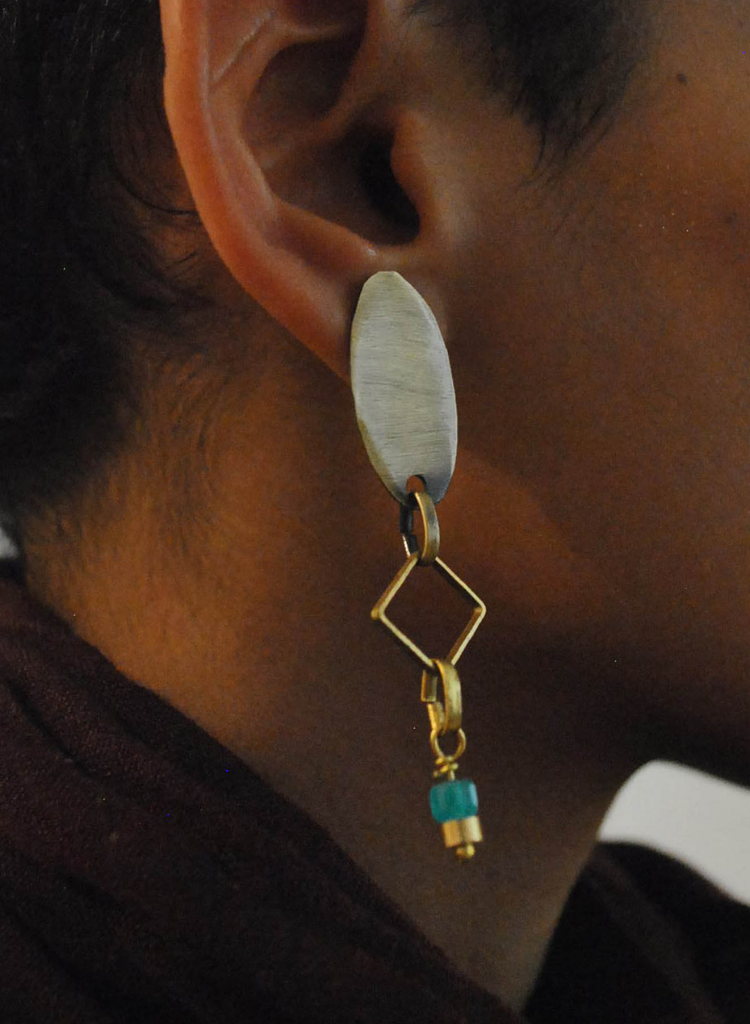 A pair of drop earrings with brass and Jade chip beads with push back closure. Length 6.5cm.