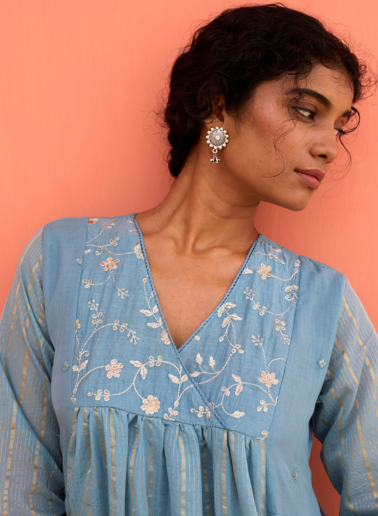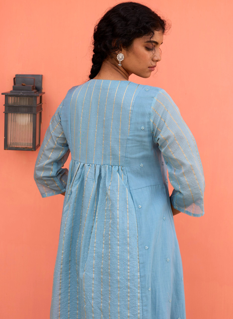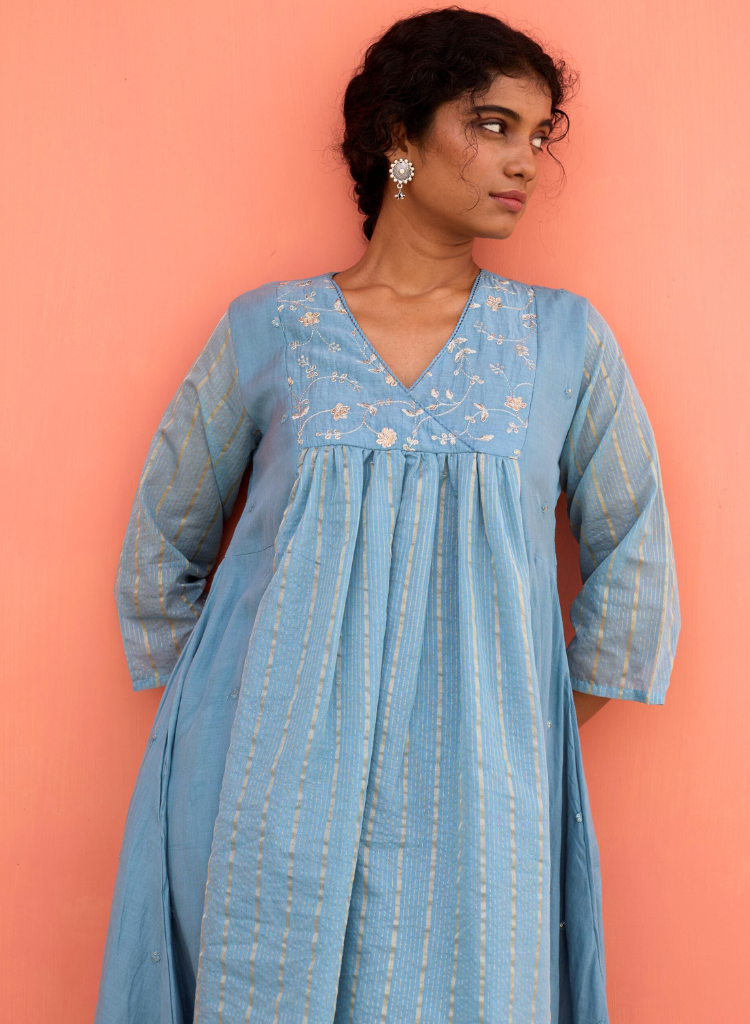 A two-piece set pairing an embroidered kurta, matching pants and dupatta. The relaxed fitting kurta with an intricately embroidered yoke features multipanel zari stripes, elegant embroidered motifs and delicate lace inserts. Length 47". Made in Chanderi, lined. The matching pants feature a fitted front, an elasticated back and inseam pockets. Length 38". Made in cotton.