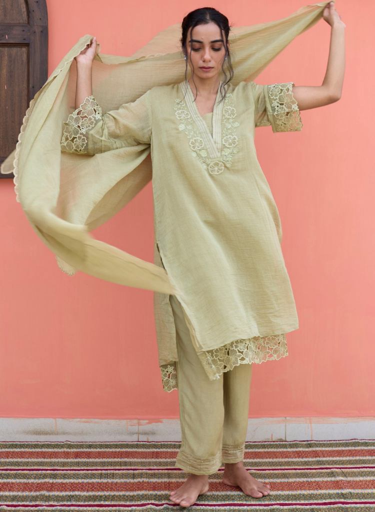 A three-piece set pairing an embroidered kurta, matching pants and dupatta. The relaxed fitting kurta with an elegant embroidered V-neck features delicate lace detailing along the sleeves and hem and subtle hand- applied pearl. Length 42". Made in Chanderi, lined. The matching pants feature a fitted front, an elasticated back and inseam pockets. Length 38". Made in cotton silk. The dupatta features scallop details.