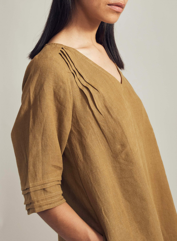 A relaxed fitting midi dress with pleat details featuring a V-neck and inseam pockets. Length 48". The model is 5'6" and is wearing size XS.
