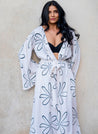 Showcasing an enchanting floral pattern in deep black hues, this robe exudes a sense of elegance and refinement. Features an open collar and a belted waist. Length 48". The model is 5'8" and is wearing a size XS.