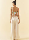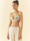 A printed bralette with lace adorning the deep plunging neckline featuring adjustable spaghetti shoulder straps and back tie-up detail. Length 10". Model is 5'8" and is wearing a size S.