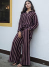 A relaxed fitting striped shirt featuring a loose collar, a front button placket, side slits and cuffed button sleeves. Length 28". The model is 5'11" and is wearing a size M.
