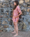 A relaxed cropped shirt with a print inspired by the waves of an ocean. Features a notch collar and coconut buttons. Length 21".