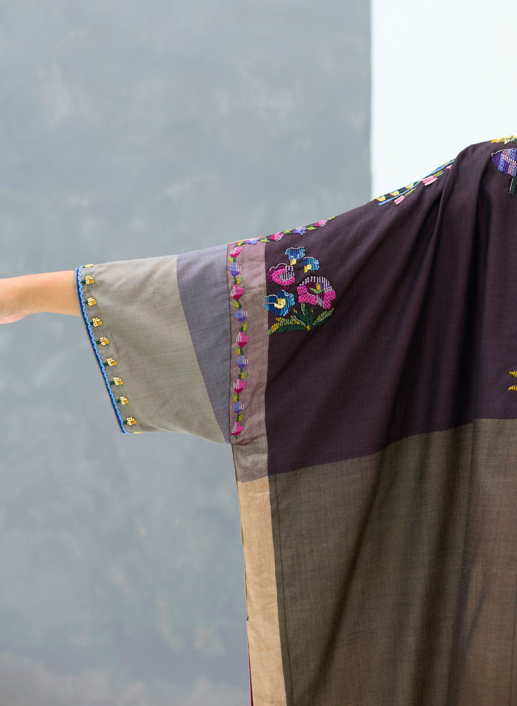 An open overlay exquisitely detailed with hand-embroidered floral motifs inspired from 18th Century Victorian textiles - pixelated flowers with geometric details as a modern interpretation designed using multi-coloured thread-work and subtle bead-work. The motifs are further highlighted with Dabka accents and traditional zari work that lend a sheen to the embroidered pattern. Length 48.5", Bust 40". The model is 5'8" and is wearing a free size.