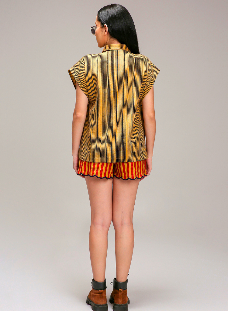 A two-piece set pairing the Tan Striped Joker Shirt and a scalloped shorts. The kaftan shirt with detailed hand appliqué work and intricate hand thread embroidery comes paired with a matching bralette. Length 26". The matching shorts feature two front pockets, two back patch pockets and finished with delicate scalloped embroidery for an elegant touch. Length 15".