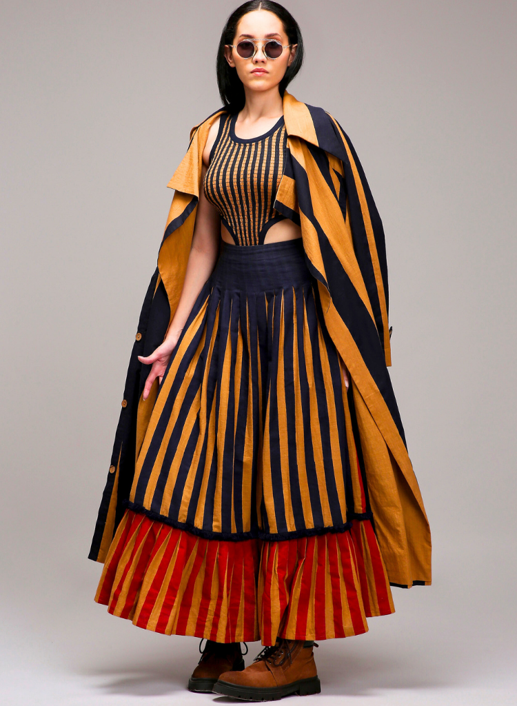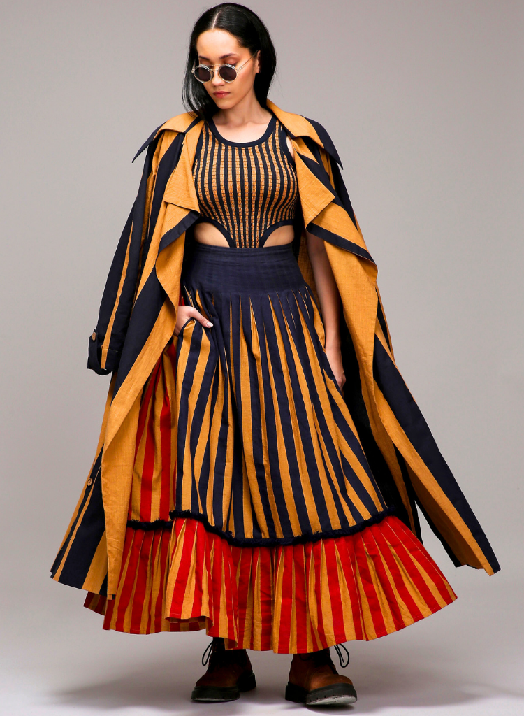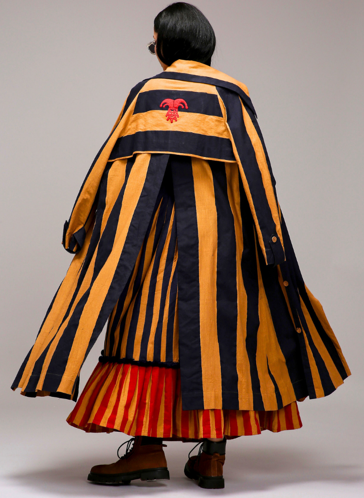 A three-piece set pairing the Striped Trench Jacket, Bodysuit and Dual Striped Skirt. Featuring hand-block printed fabric, long sleeves, and intricate button detailing, this jacket stands out with a bold joker embroidery on the back and a stylish slit opening for added flair. Length 50". The dual-striped skirt with hand-blocked stripe patterns and a contrasting pleated side panel features pleated detailing at the waistband, two functional side pockets, and a concealed zipper offering both style and comfort. A fringed lace trim on the lower half adds a unique textural accent. Length 40". The matching smocked bodysuit features cotton rib detailing at the neckline, armholes, and hem for a snug, comfortable fit. Length 24".