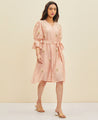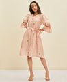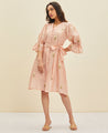 An A-line dress with hand embroidered flowers and statement drawstring sleeves. Features a V-neck and pearl buttons on the front. Comes with a matching detachable tie up belt and a cotton slip. Length 38".