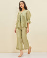 A two-piece set pairing the Teri Blouse and Pants. The open front blouse hand embroidered flowers, a tie-up neck and gathered drawstring sleeves. Length 23". The flared pants feature a concealed side zipper. Length 35".