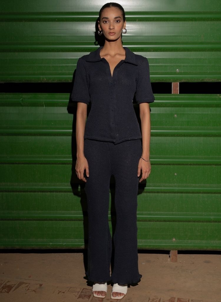A pair of semi-sheer bell-bottom pants with knitted 'double-tuck' texture featuring a fitted waist. Length 35"-36". The model is 5'9" and is wearing size S.