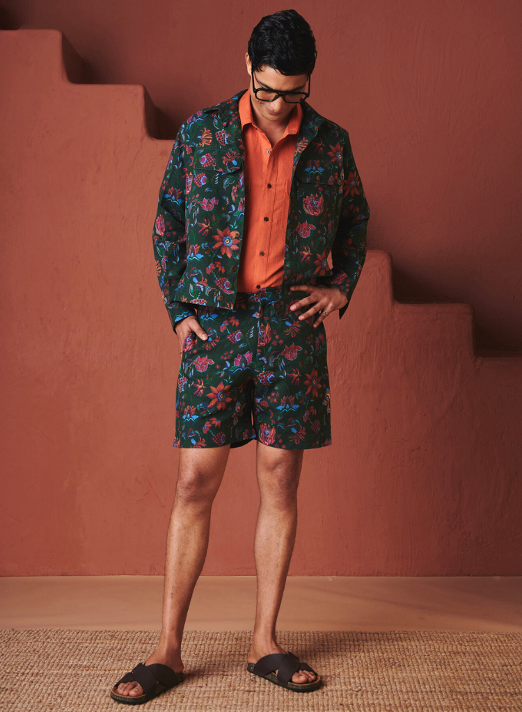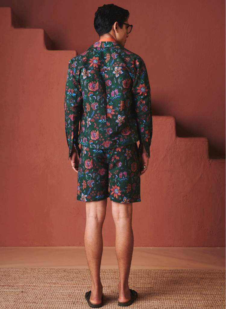 A two-piece set pairing the Paan Chintz Trucker Jacket and matching shorts. The relaxed structured long sleeve jacket features utility-inspired flap pockets and a classic collar. The matching shorts feature a fitted waist and inseam pockets. The model is 5'7", and is wearing size S.