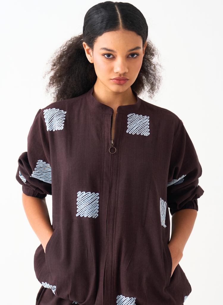A loose jacket with all over square wave embroidery detail featuring a front zipper detail. Length 26.5". The model is 6' ft and is wearing a size M. Made in handwoven cotton.