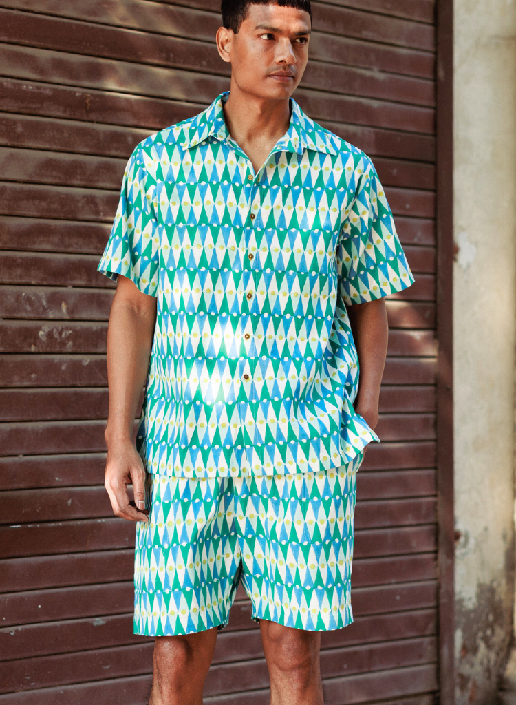 A hand block printed, regular-fitting shorts featuring an elasticated waist and inseam pockets. The model is 5'11" and is wearing size S-M.