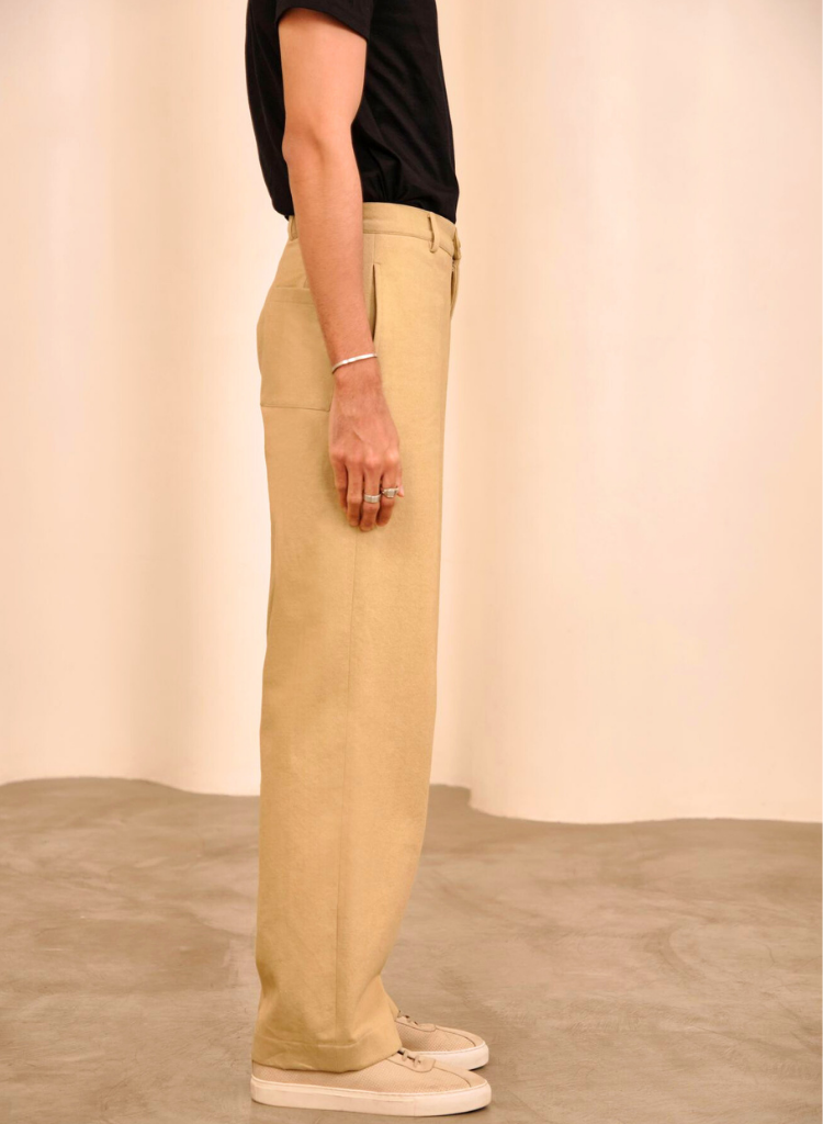 A pair of relaxed fit pants featuring front closure, side pockets and back patch pockets. Length 42.5". The model is 5'8" and is wearing size S.