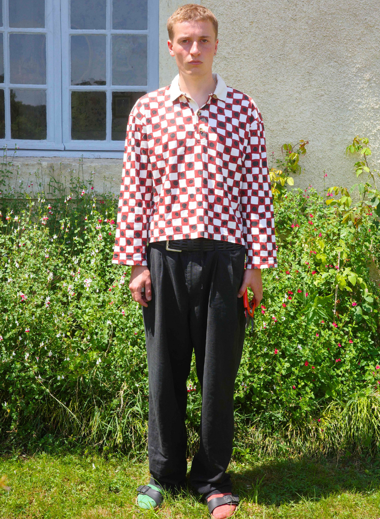 A shirt featuring a spread collar and three button placket. Length 24". The model is 5'6" and is wearing a size S.