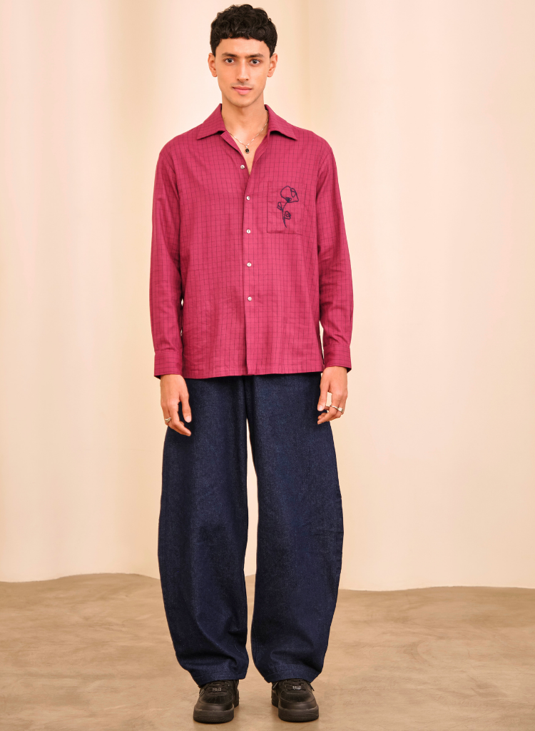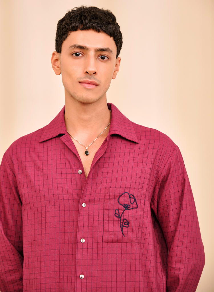 A relaxed fit shirt with an embroidered chest patch pocket featuring an open collar, front button closure and regular cuffs . Length 28.5" . The model is 6' and is wearing size S.