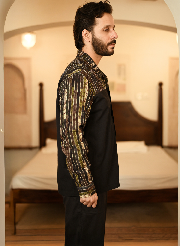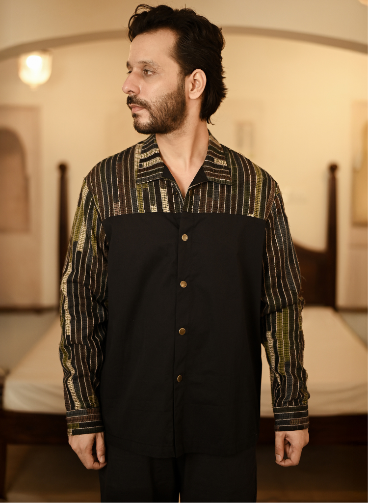 A tailored shirt with a pleated printed panel and front metal zipper opening featuring a classic collar and long cuffed sleeves. The model is 5'7", and is wearing size S.