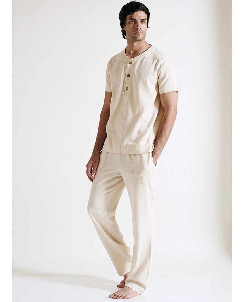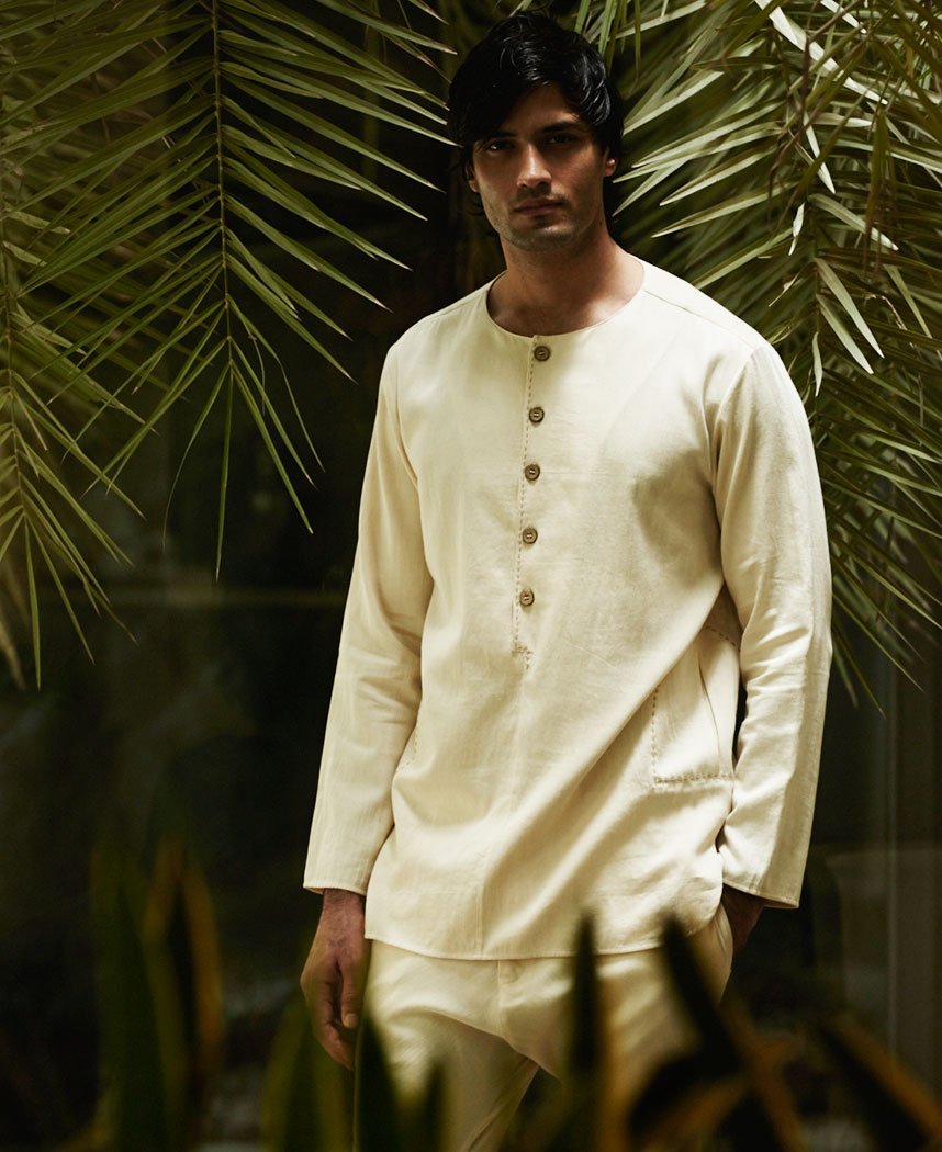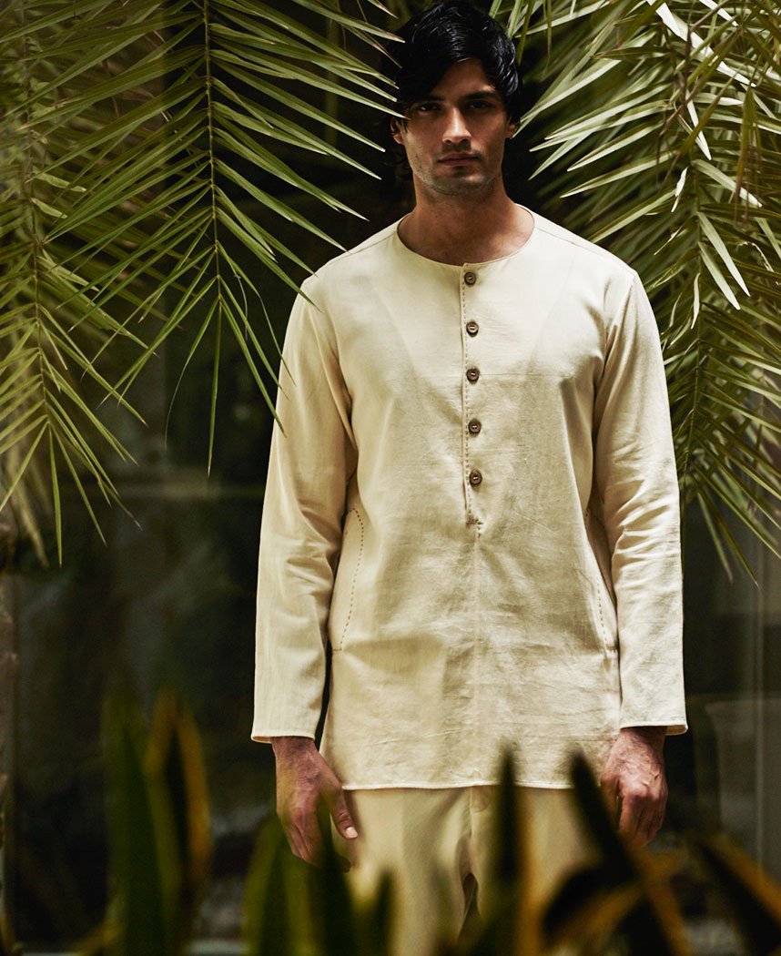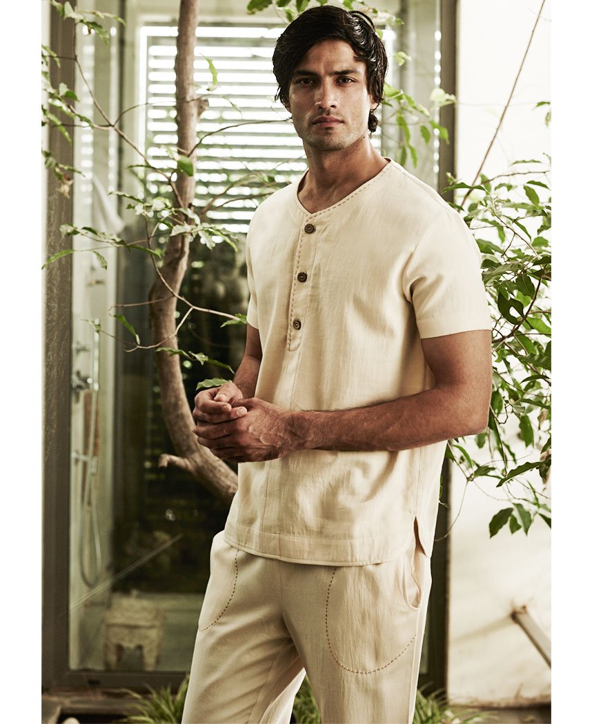 An easy yet statement edit of men’s tops, t-shirts and kurtas that will definitely be a conversation starter. Our tops for men are crafted keeping conscious clothing practices in mind. You can explore Ikat weaves, Ajrakh, Dabu prints, Textured and Creased cotton, Quilted cotton, Ayurvedic treated fabrics and Peta Approved Vegan clothing. A little more about our specialty clothing below -