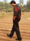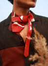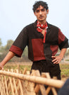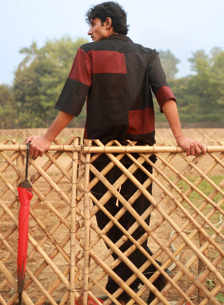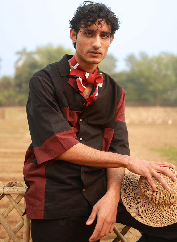 A bold, oversized shirt featuring half sleeves, a classic collar, and button-down closure. Crafted with striking patchwork in black and deep maroon tones, it offers a sophisticated yet casual appeal for versatile styling. Length 27". The model is 5'11" and is wearing size S.