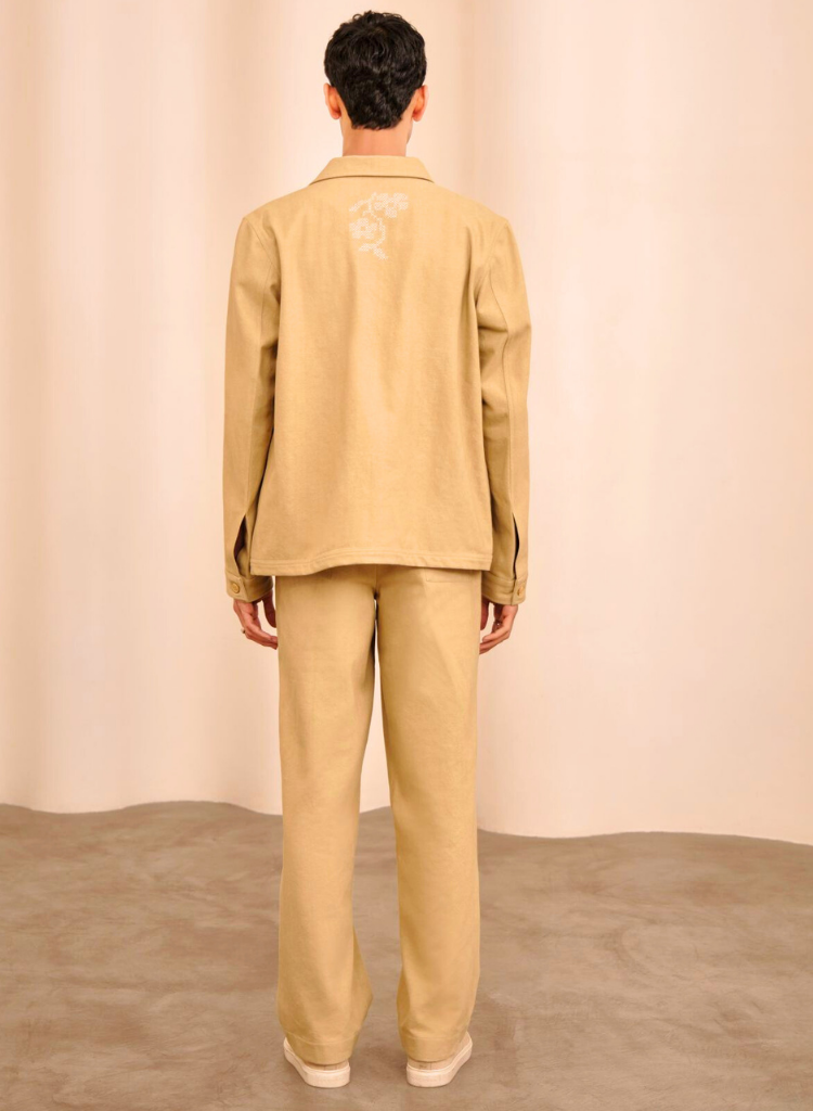 An open collar jacket with hand embroidery on front shoulders and centre back featuring front button closure and shoulder drop. Length 28" . The model is 6' and is wearing size S.