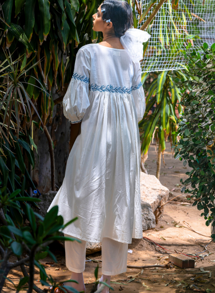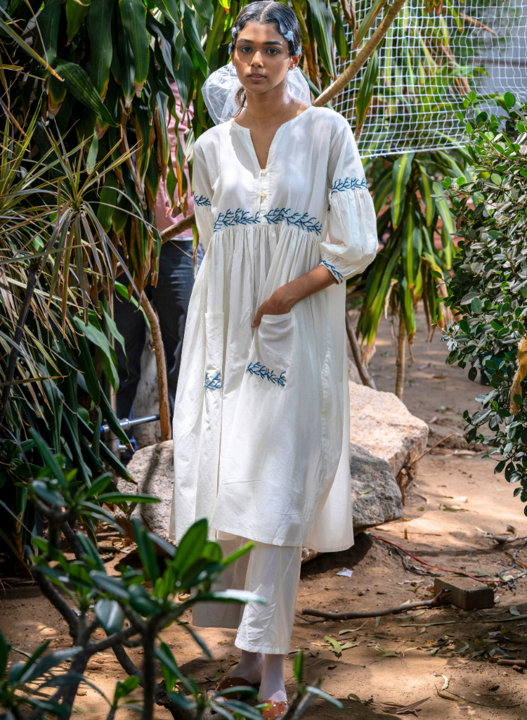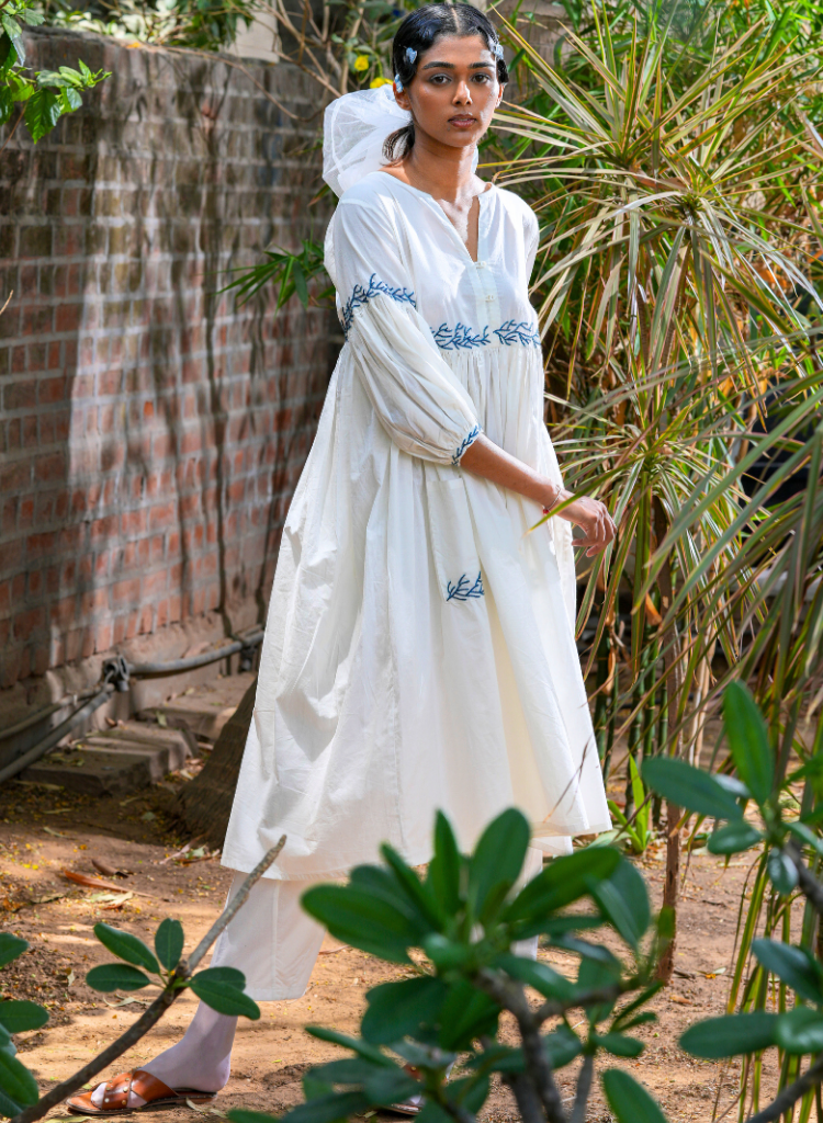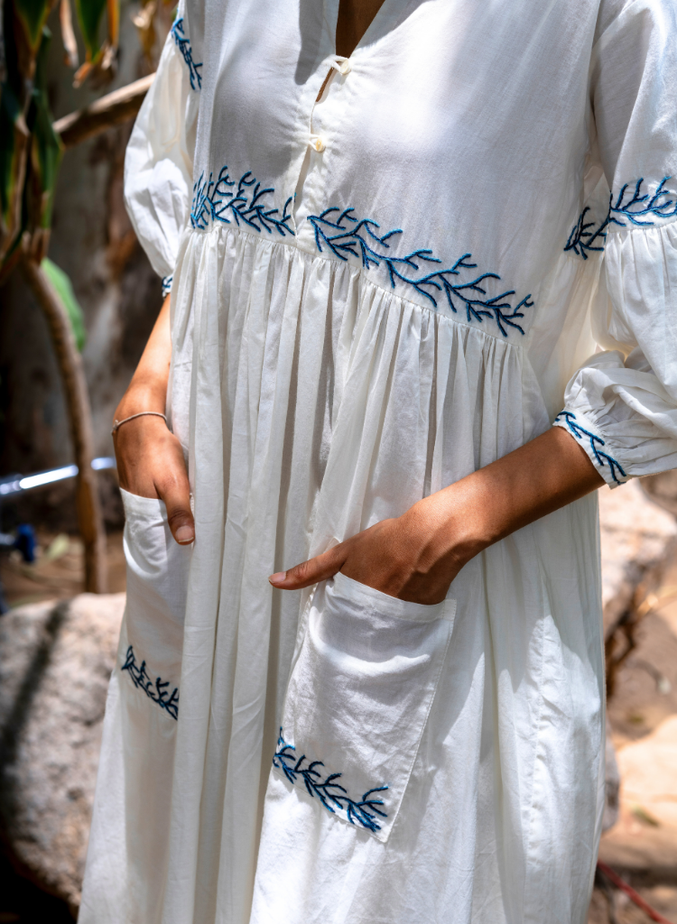 A two-piece set pairing the Coral Flame Dress and the Pristine Taper Pants. This gathered A-line dress features two front patch pockets (7.5" long and 6" wide). The sleeves are a standout element—half set-in sleeves and half balloon sleeves. The gathered body of the dress adds volume and ease. Coral embroidery is placed in a way to highlight the seams and pockets. It is done using stem stitch. Length 45", Bust 37". The tapered pants feature a gathered, elasticated back for comfort and concealed pockets for a neat finish. Length 36". The model is 5'11" and is wearing a size M.