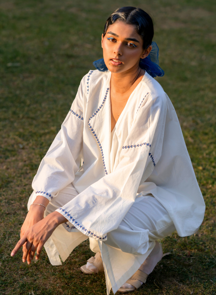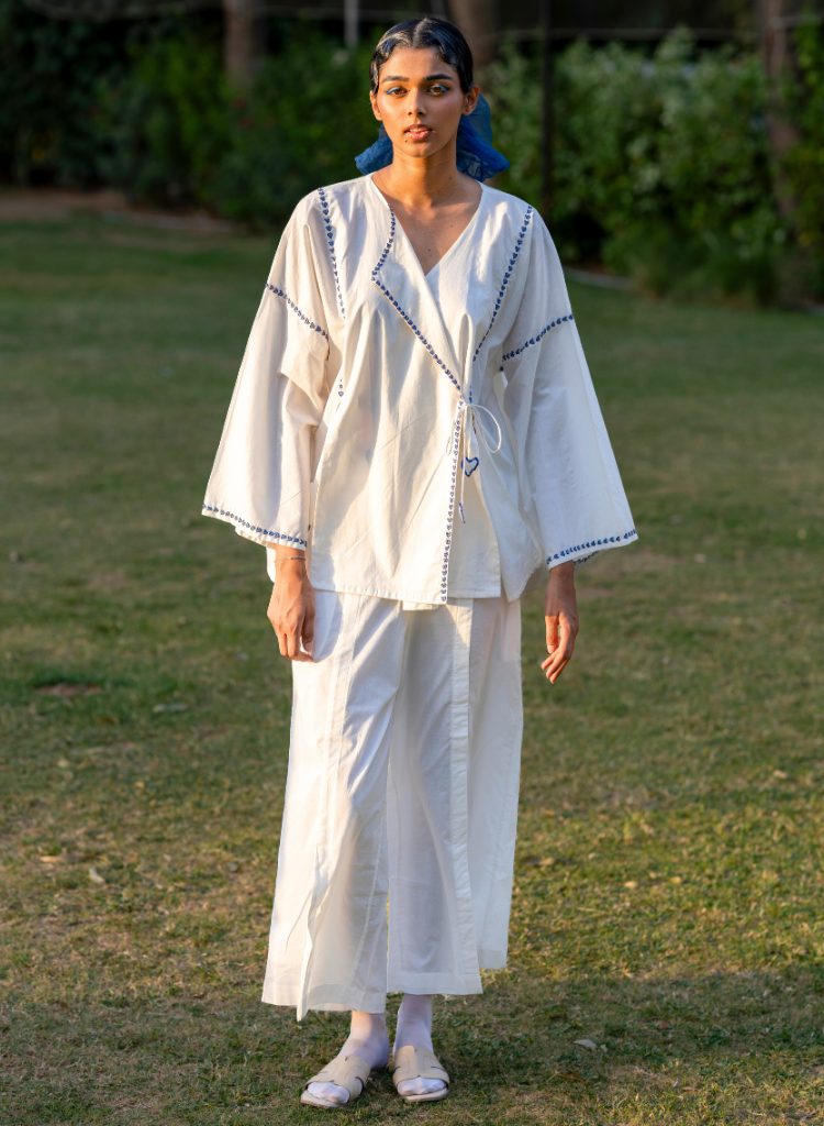 This silhouette is defined by front paneling, creating a structured silhouette. The panels have slits for movement and ease. At the center back, a single inverted box pleat opens gently with movement, offering fluidity. The flap collar adds a sophisticated detail. Heart coral motifs are embroidered across the surface and heart-shaped tassels are tucked to finish the edge of cords. Length 28", Bust 51", Hips 51". The model is 5'11" and is wearing a free size.