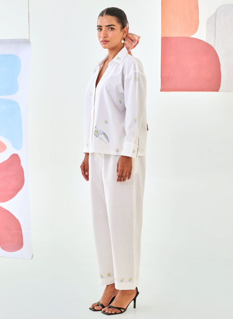 A two-piece set pairing the Floral Shirt and pants. The relax-fit shirt with intricate floral embroidery and a charming bird motif near the hem features a classic collar and cuffed sleeves. Length 23-24". The pant features an elasticated waist. Length 36-37". The model is 5'5" and is wearing size XS.
