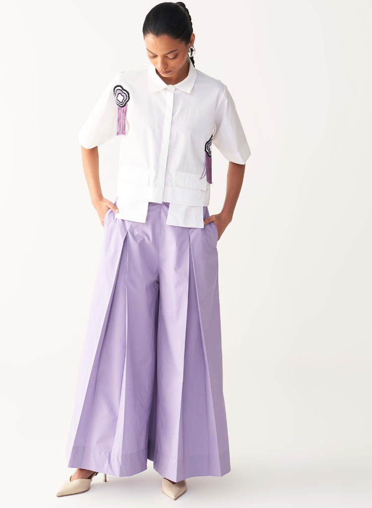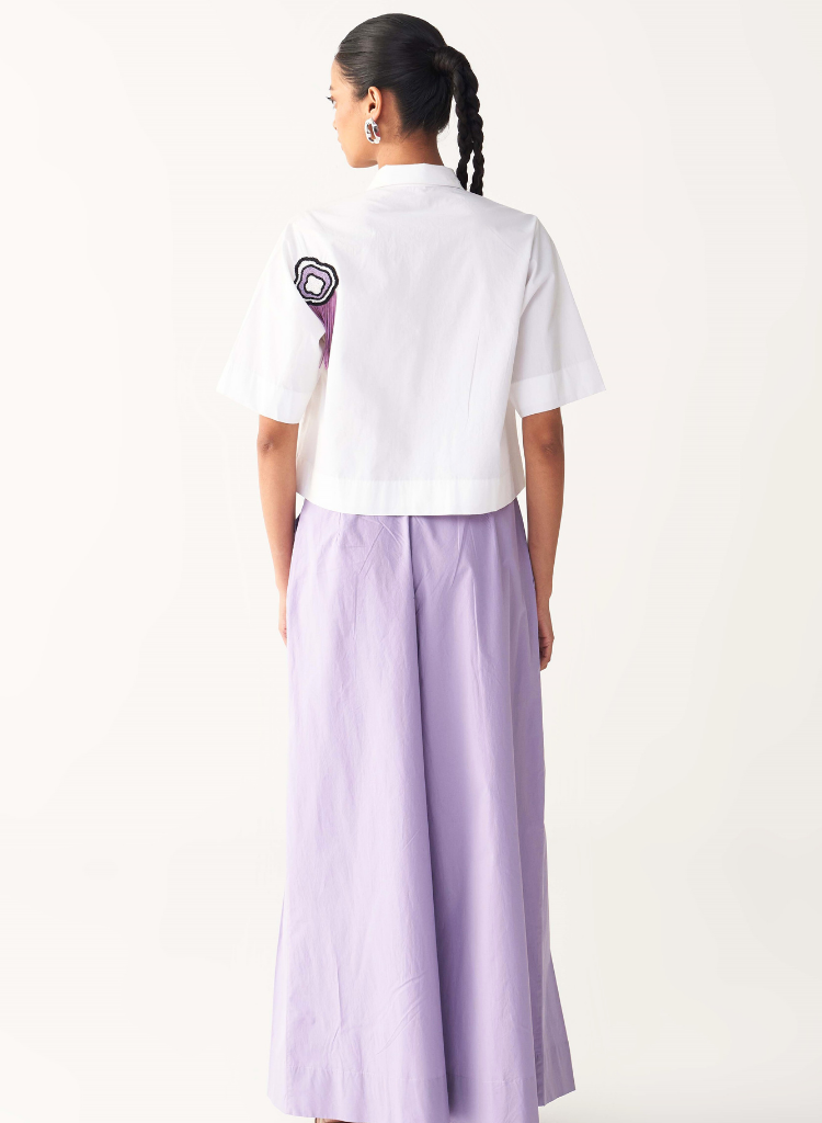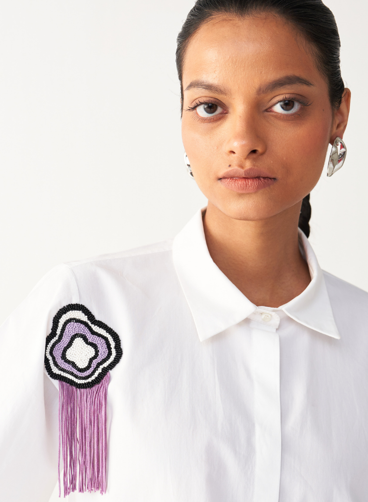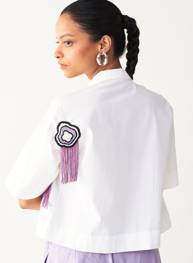 A cropped shirt with fringe embroidery details featuring a pointed collar, a concealed front button placket and extended pockets. Length 18". The model is 5'7" & is wearing size S.