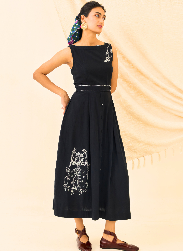 A sleeveless dress with delicate white hand embroidery featuring contrast stitch details along the neckline and waist, functional side pockets and button-down front . Length 49". The model is 5'7" and is wearing a size XS.