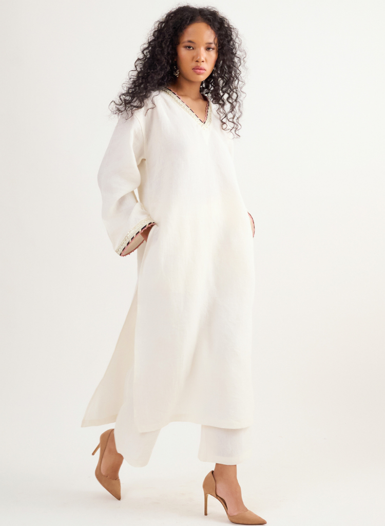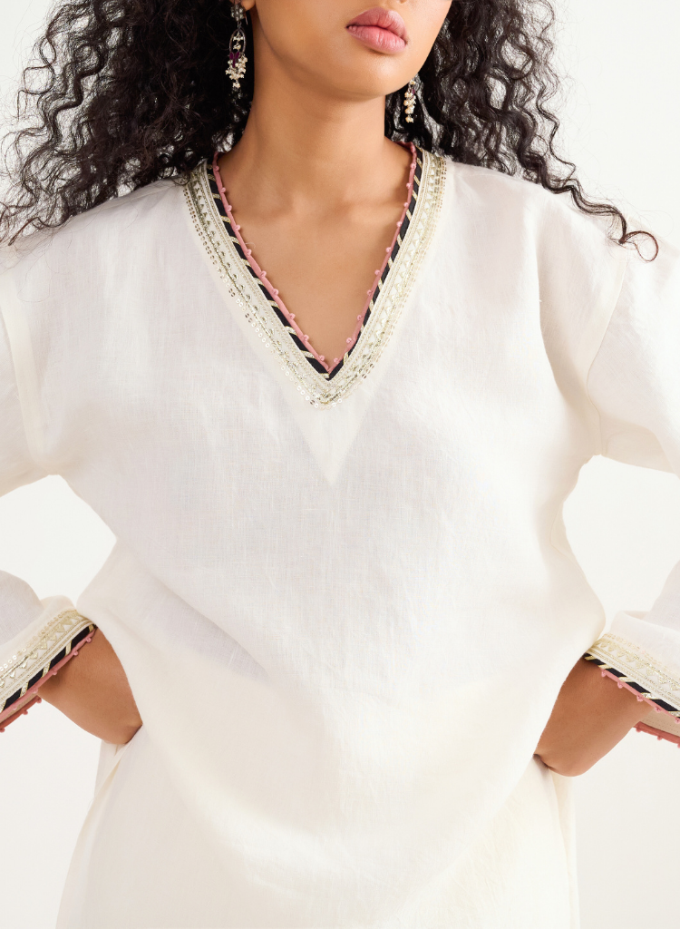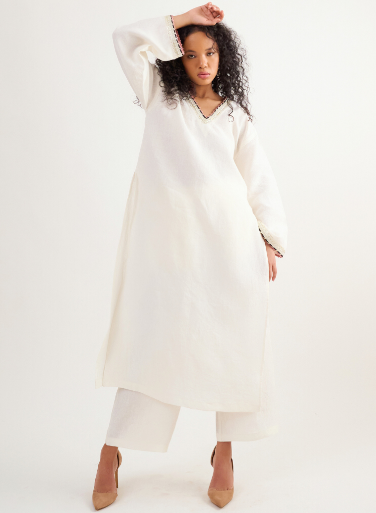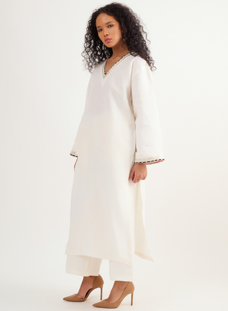 A two piece set pairing a V-neck kurta and matching pants. The kurta with intricate hand-embroidered detail and a sequence finish features a V-neck and wide sleeves. Length 48". The matching pants feature a fitted waist with pleat details and inseam pockets. Length 36". The model is 5'7" and is wearing size XS.