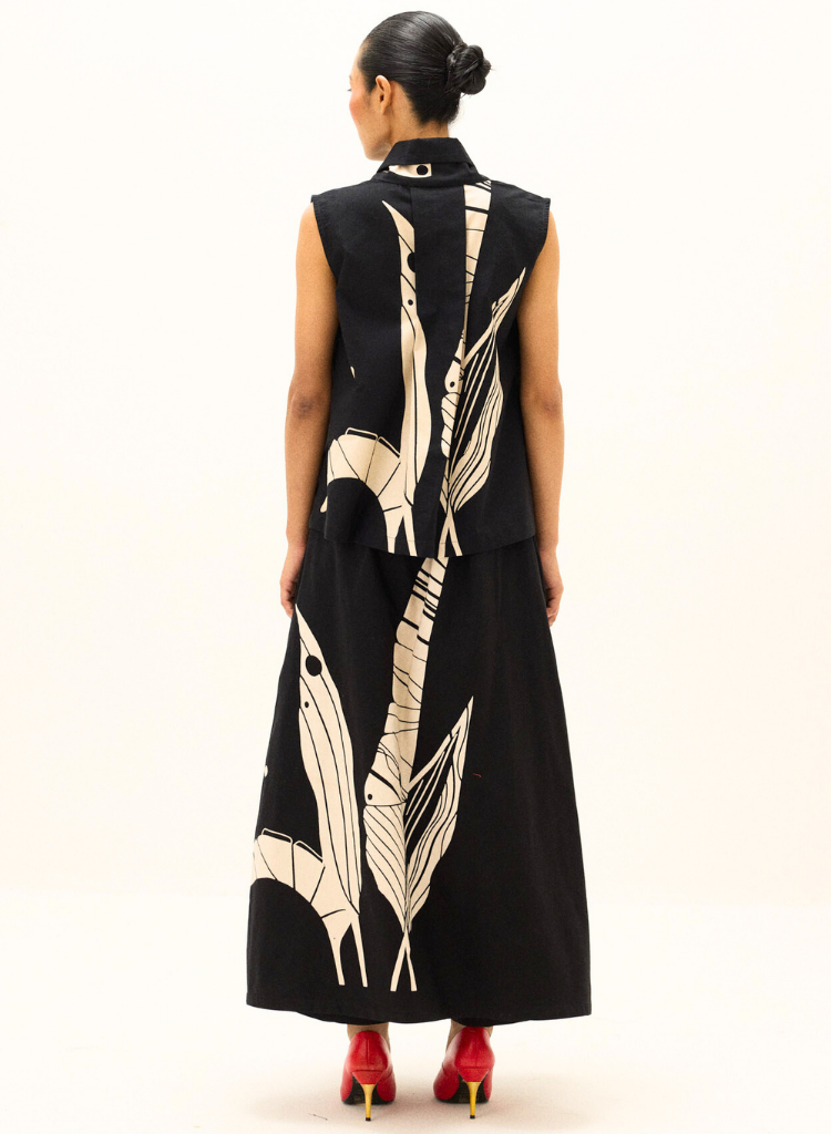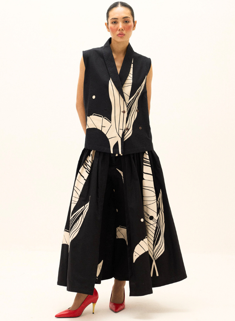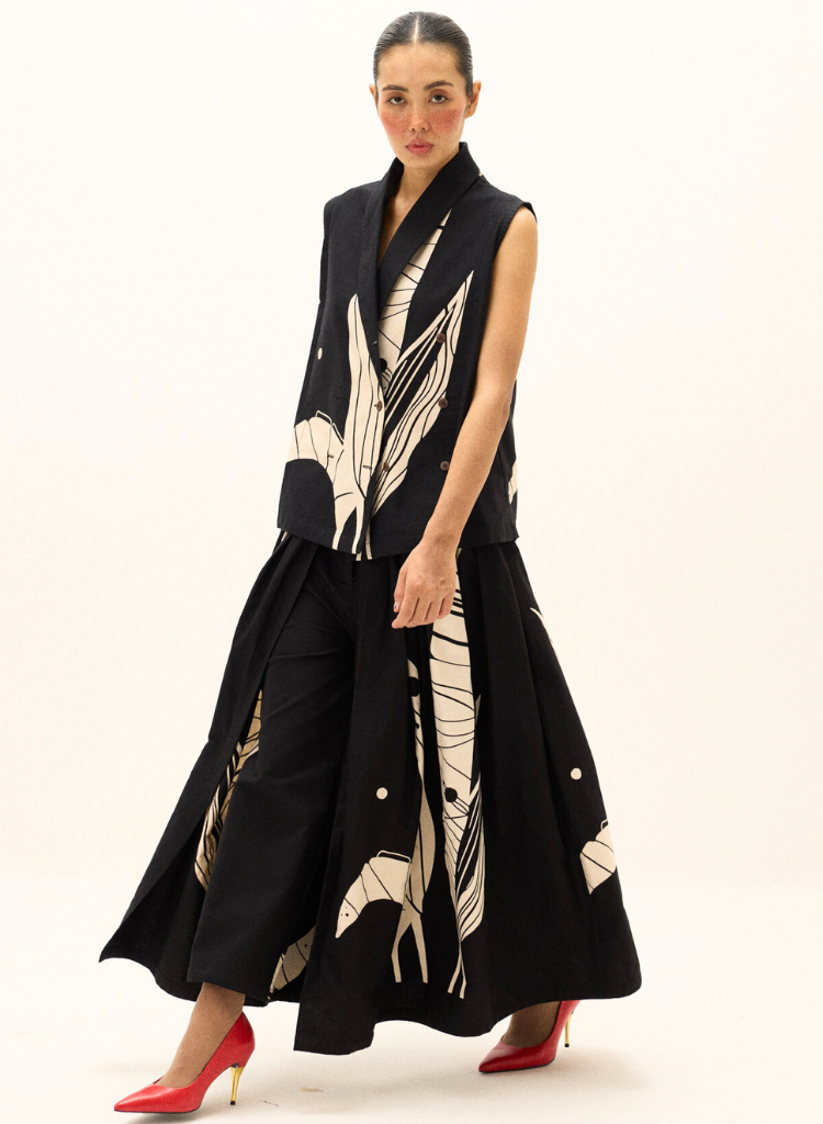 A two-piece set pairing the Palmsway Blazer and the Palmsway Pants. The sleeveless double-breasted blazer with bold palm motifs features a structured collar and sharp tailoring. Length 26". The matching wide legged flared pants accentuated with bold palm motifs. Length 38". The model is 5'6" and is wearing a size S.