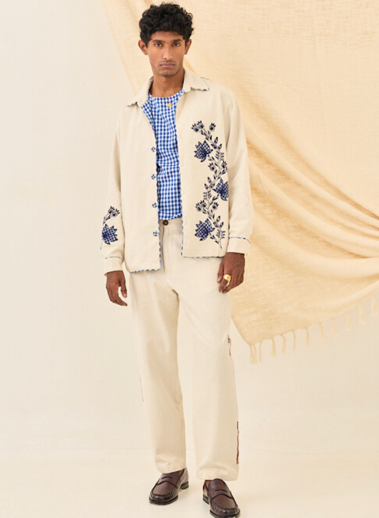 A button down jacket with exquisite gingham floral appliqué flowing across the front and sleeves featuring a classic collar and pignose button. Length 29". The model is 6'2" and is wearing a size M.