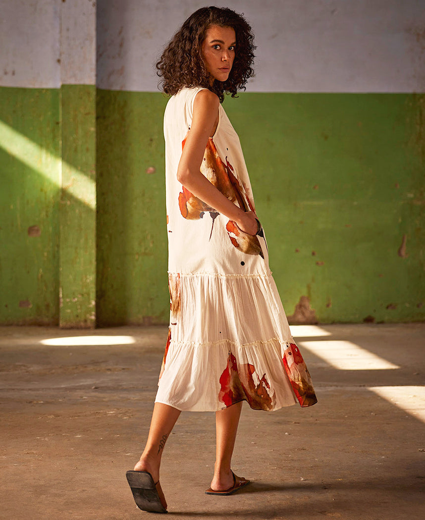 A printed midi dress with frilled tiered panels featuring a V-neck and inseam pockets. Length 46". The model is 5'6" and is wearing size S.