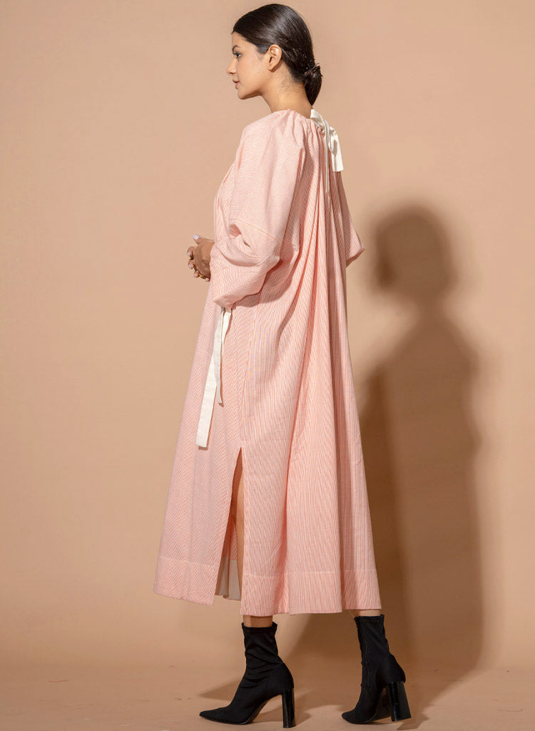 A relaxed-fitting kaftan-style midi dress with a gathered neck and sleeves hem with tie-up details featuring a round neckline and side slits. Length 47", Bust 68", Shoulders 43. The model is 5'6" and is wearing a free size.