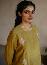 A two-piece pairing the Ira Kurta and the Irene Trousers. The relaxed fitting kurta with statement hand embroidery using traditional Zardozi embroidery techniques features a crew neckline, side slits and 3/4th sleeves. Length 42". The relaxed fitting trousers with hand embroidered motifs feature a drawstring tie-ip in the front, an elastic waistband at the back and inseam pockets. Length 39". The model is 5'5" and is wearing size S.
