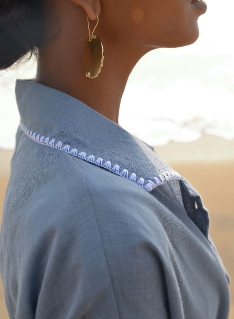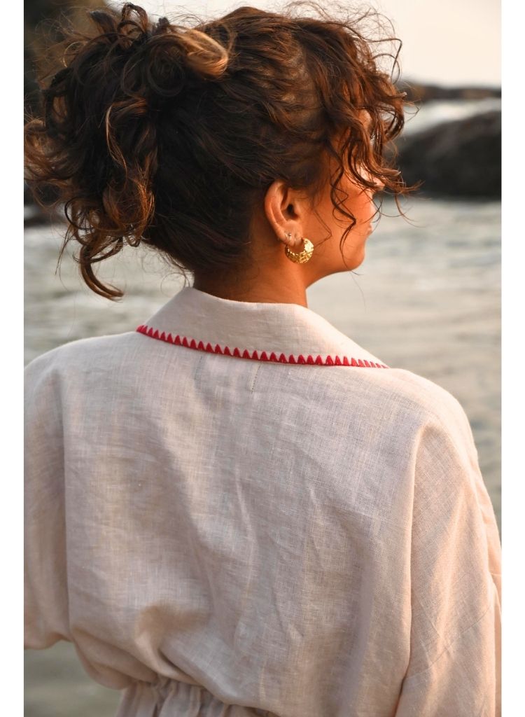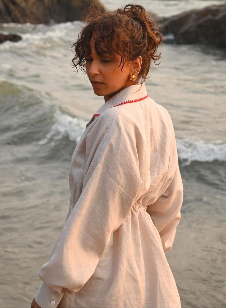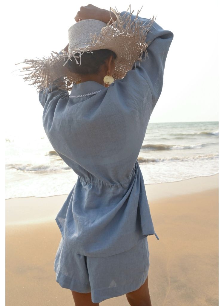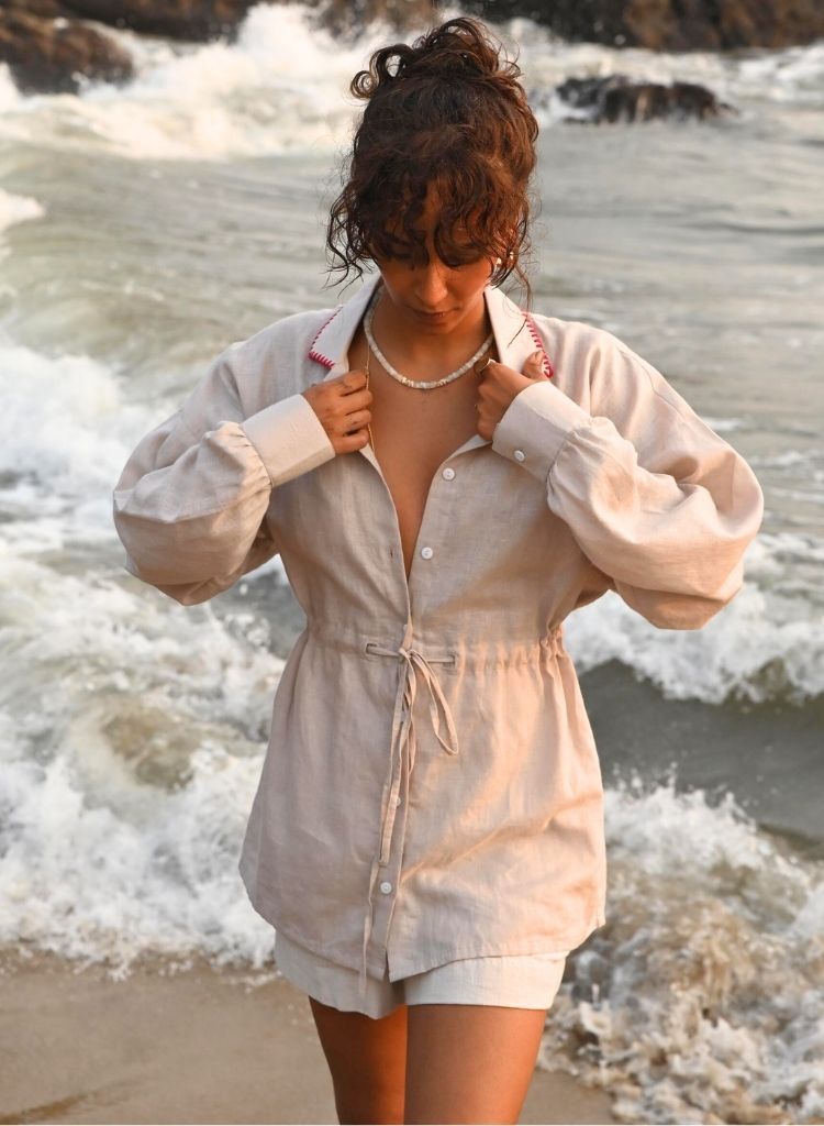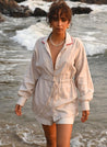 A two piece set pairing the Jade String Shirt and the Willow Darted Shorts. The oversized shirt with a front button-down placket, adjustable drawstring waist, and embroidery details on the collar features a classic collar and long cuffed sleeves. Length 28". The wide-leg shorts with a high-rise waist, darts and side pockets feature a button and zip fly centre closure. Length 15.5". The model is 5'9” and is wearing size S.
