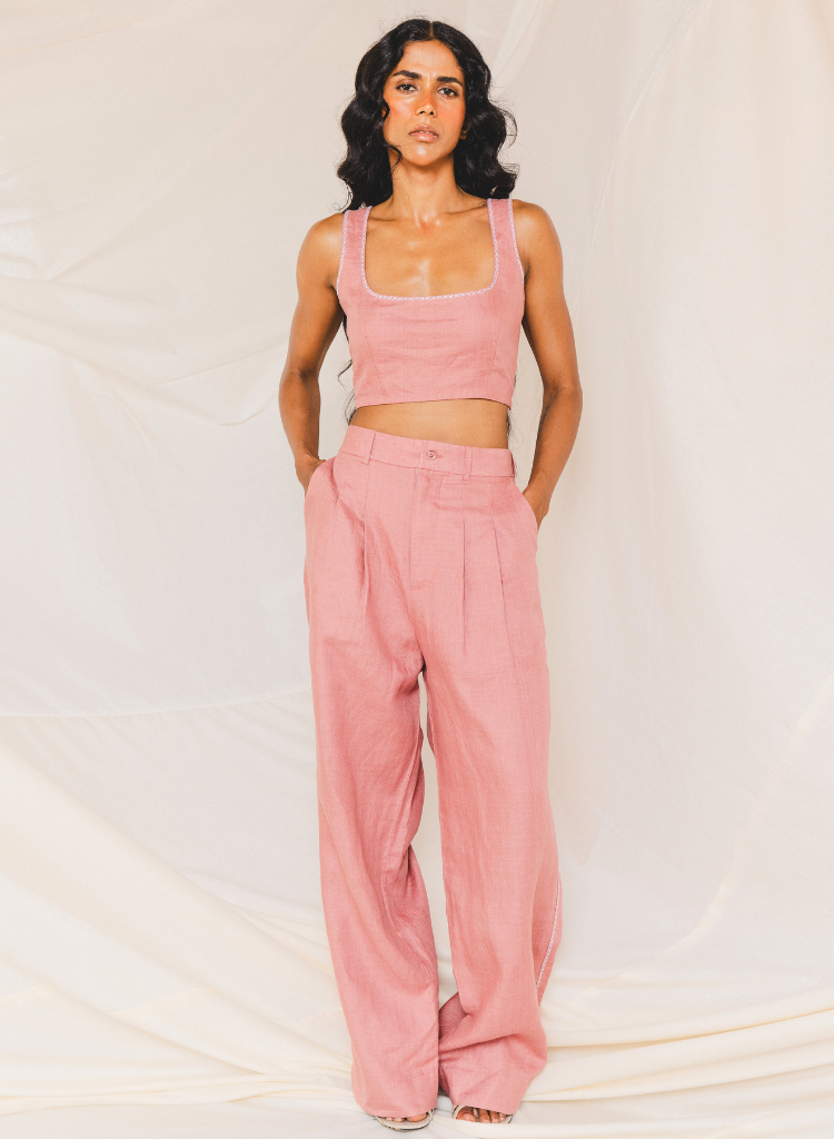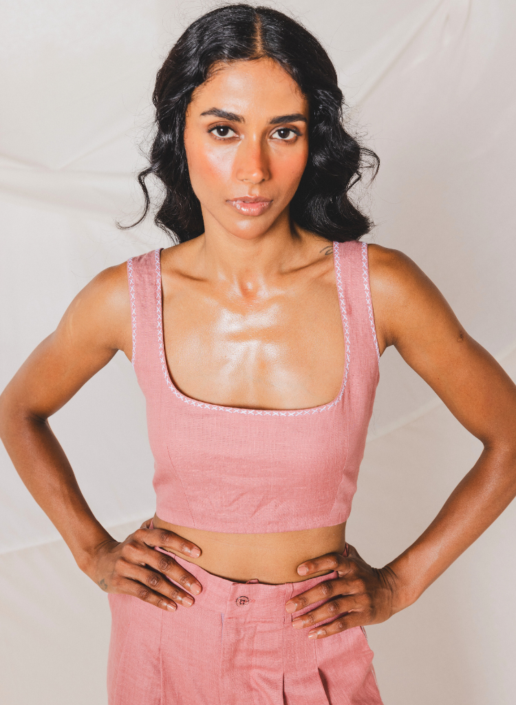 A crop top with embroidery details featuring a square neck and wide straps. Length 14". The model is 5'9” and is wearing size S.