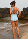 A mid-waisted bikini bottom with extra coverage featuring a thick waistband. Length 10". The model is 5'9” and is wearing size S.