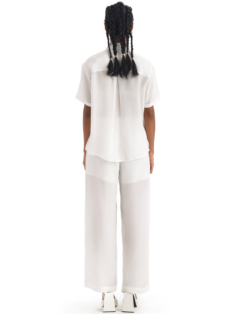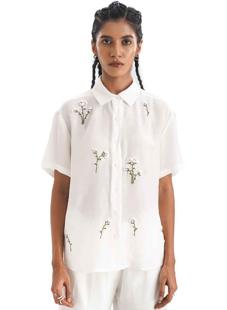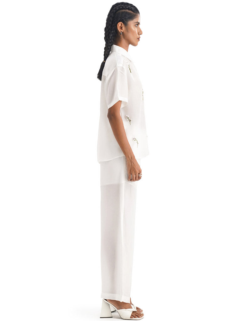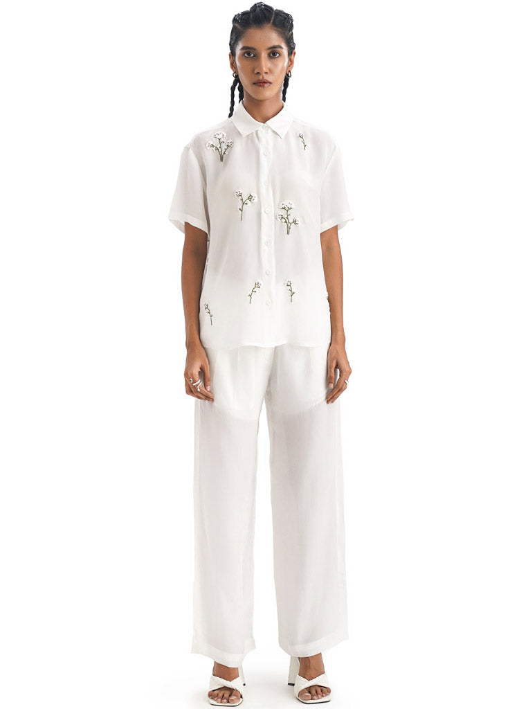 A two piece set pairing a floral shirt and matching pants. The floral embroidered shirt features a front button plakcet and short sleeves. Length 27". The matching pants feature a fitted waist with a zipper and inseam pockets. Length 40". The model is 5'8" and is wearing a size S.