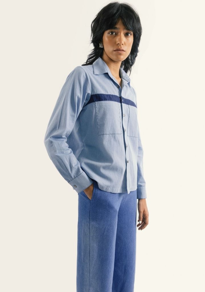 A regular fitting shirt with a contrast panel and contrast top stitch details featuring front patch pockets and cuffed sleeves. Length 24". The model is 5'8" and is wearing size XS.
